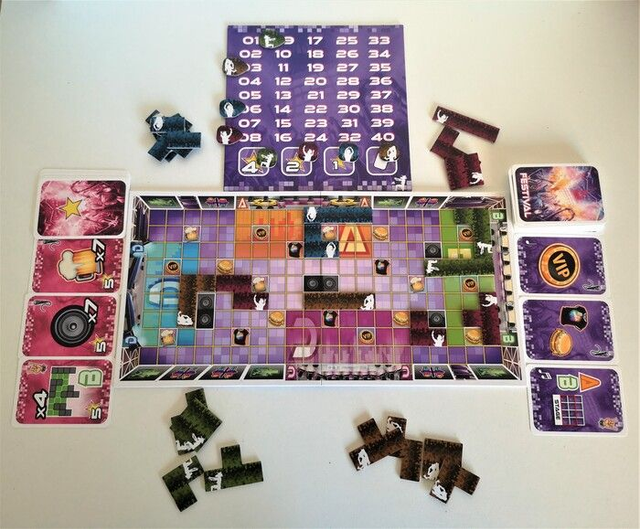 Des cartes vous donneront des objectifs : avoir 7 personnes dans la fosse, 4 collées à des enceintes, 3 au bar, le plus possible dans les premiers rangs d'une scène etc. Placez chacun 1 tuile public dans le festival à chaque tour. Jeu très dynamique. Attention, aucune tuile ne peut dépasser du plateau ! Débrouillez-vous pour avoir le plus de public possible collé à l’objectif… Au moment ou il faut accomplir celui-ci !