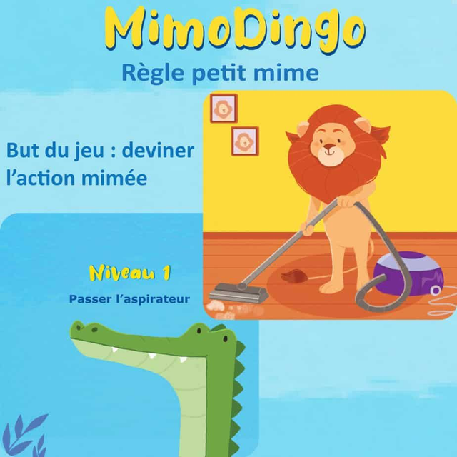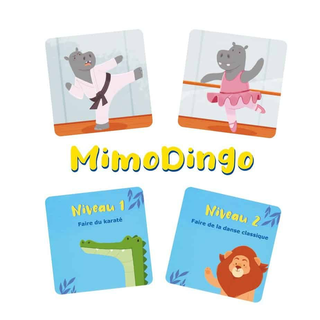 Jeu d’expression par le mime et de langage. MimoDingo permet de travailler la prise de parole ainsi que la construction de phrase dès 2 ans. Le jeu propose 4 règles: