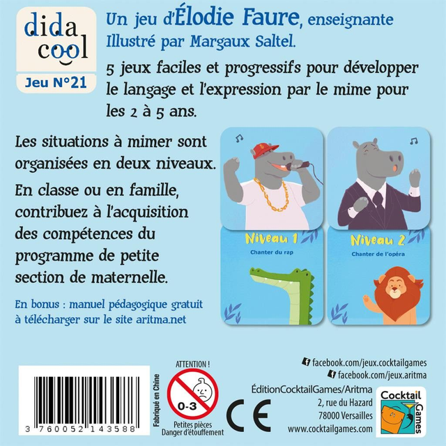 Les cartes sont organisées sur 2 niveaux, permettant de s’adapter à l’enfant et à sa progression. Les situations à mimer sont toutes des situations familières ou connues
