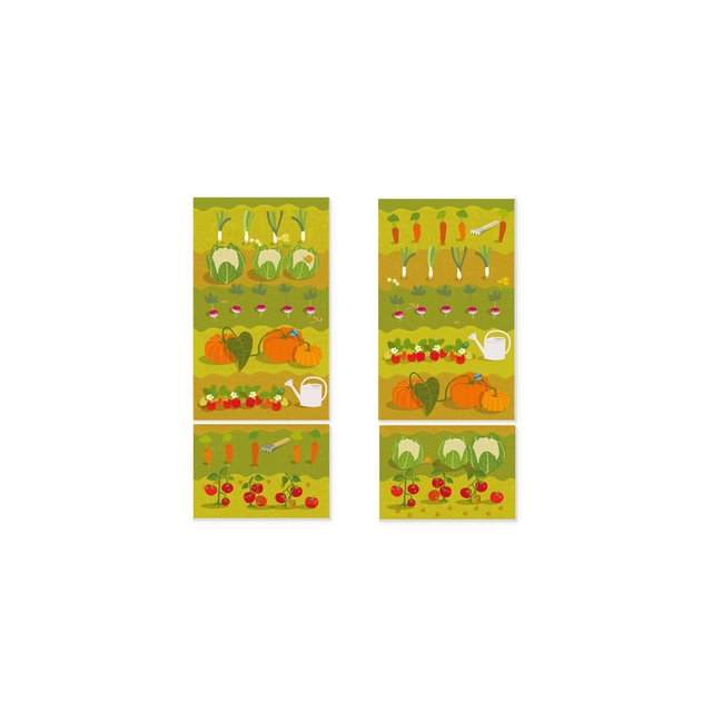 Associez 2 cartes, l’une représentant 5 rangées de fruits et légumes, et l’autre les 2 complémentaires. À chaque tour, une grande carte est mise en jeu. Les joueurs doivent retrouver en premier et pointer du doigt la petite carte complémentaire parmi les 20 réparties sur la table. L’association est bonne si les 7 fruits et légumes sont présents dans le potager reconstitué.