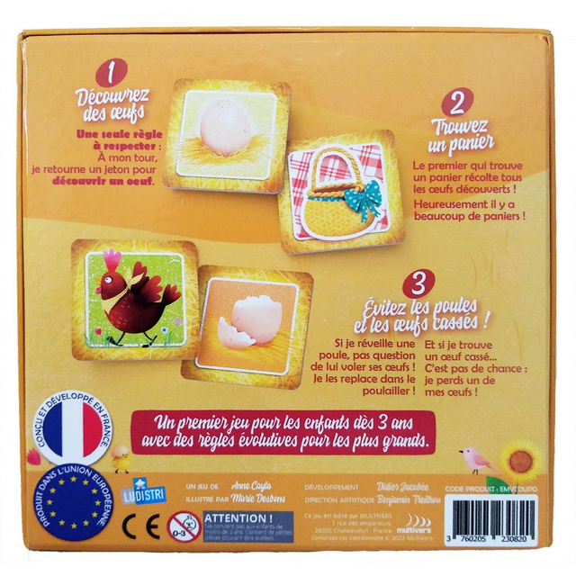 Vous devrez trouver les œufs, et pour les récupérer trouver un panier, sans tomber sur un œuf cassé ou une poule qui reprendra son œuf.
